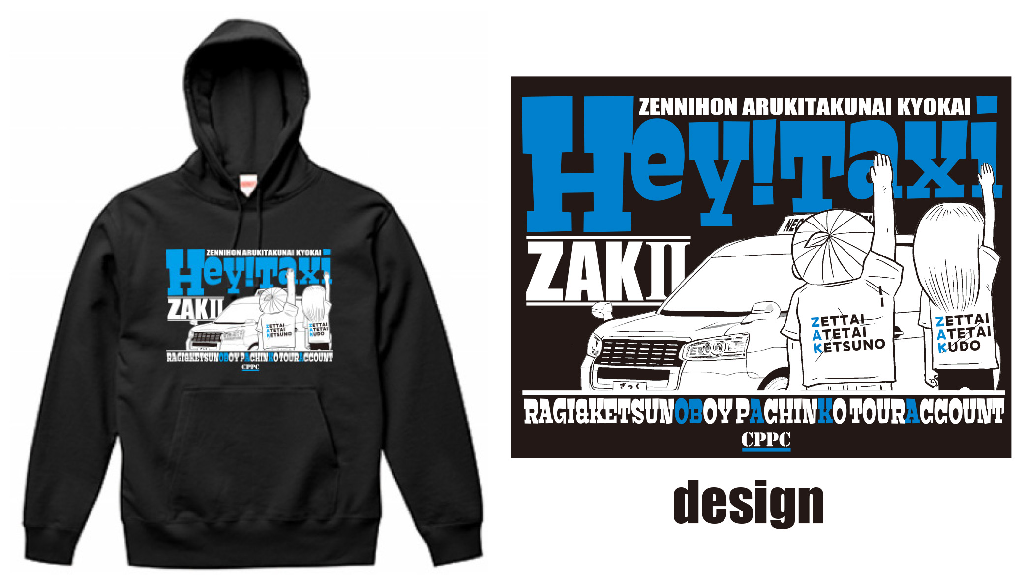 工藤らぎとケツノ少年がタクシーを停めているイラストに「Hey!Taxi」の文字を配置した可愛いパーカーが完成!